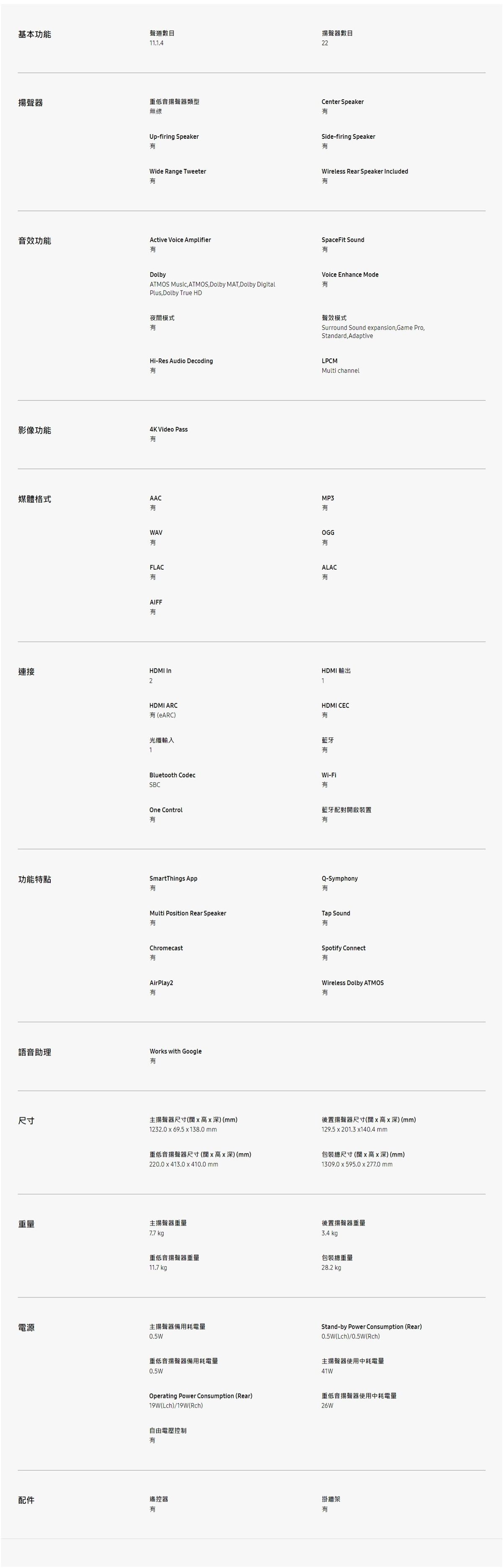 重量:主揚聲器: 7.7kg / 後置揚聲器: 3.4kg / 重低音揚聲器: 11.7kg