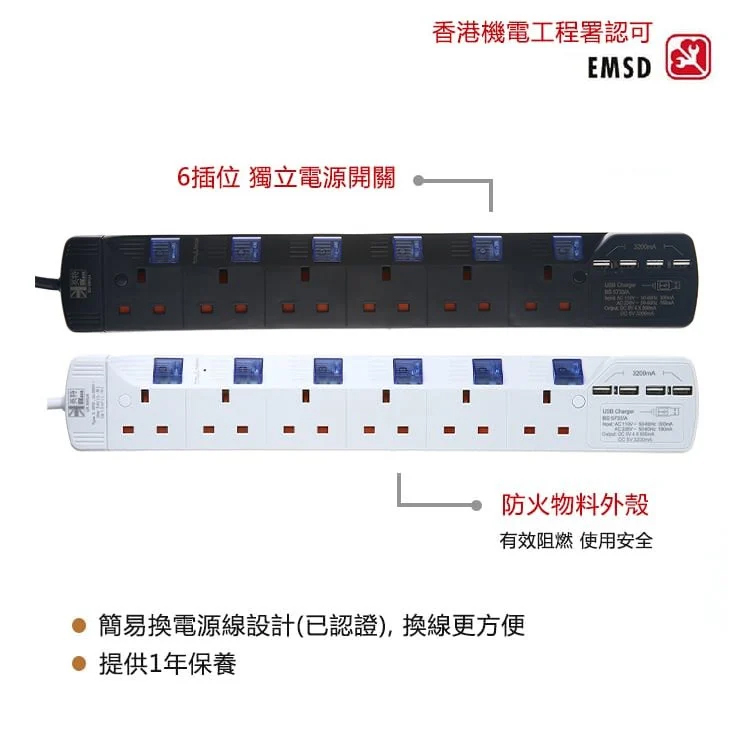 *SU886U4防雷電拖板已通過 (香港機電工程署) 驗證及符合最新英國及國際安全標準BS1363, BS5733及EN60950*